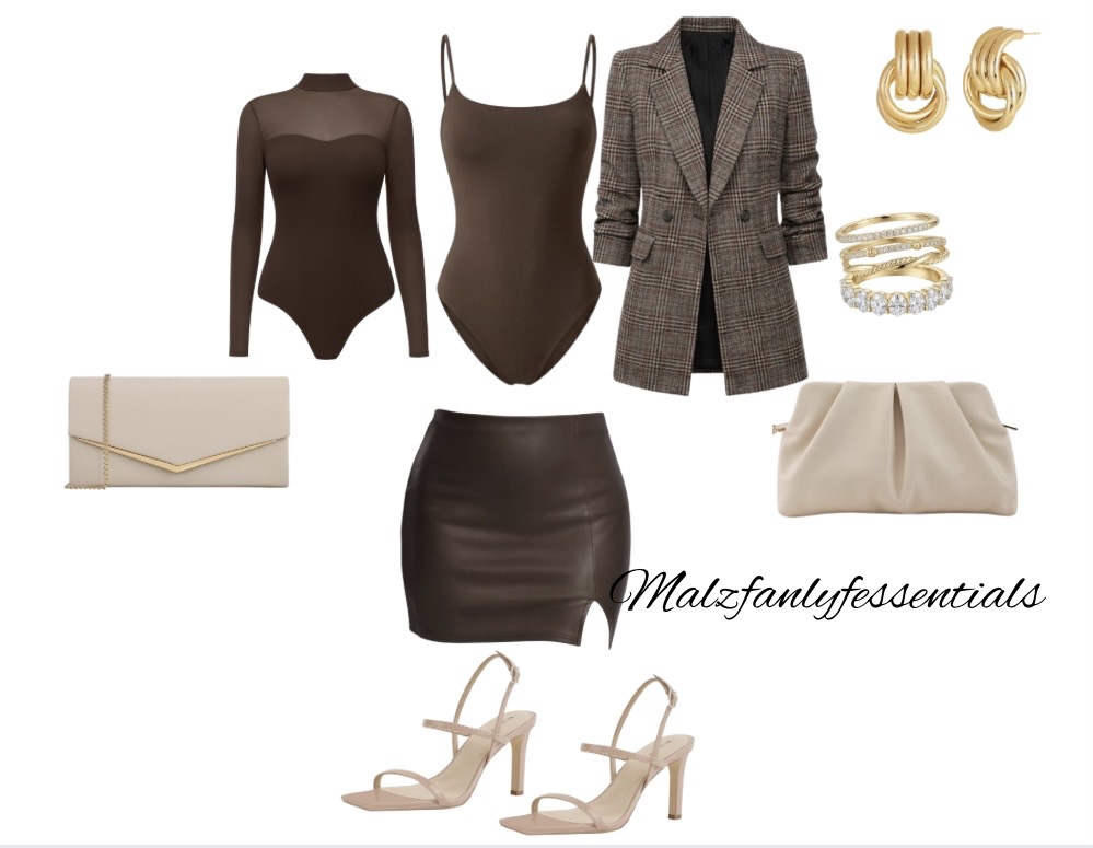 Turn heads and own the moment in this rich, mocha-toned dream. Featuring a sleek chocolate bodysuit layered under a tailored plaid blazer, this look blends soft femininity with boss-level confidence. The fitted faux leather mini skirt adds just the right amount of edge, while nude strappy heels and a chic neutral clutch keep things effortlessly polished.