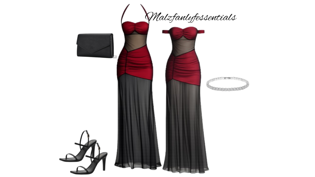 Turn heads and own the night in this striking burgundy and black maxi dress. Featuring a ruched bandeau-style top, a delicate lace panel through the waist, and a sheer flowing skirt, this piece perfectly balances elegance with a bold, modern edge. The flattering silhouette hugs in all the right places before cascading into a soft, airy finish—making it the perfect statement look for nights out, special events, or any moment you want to feel effortlessly confident.