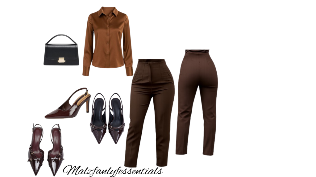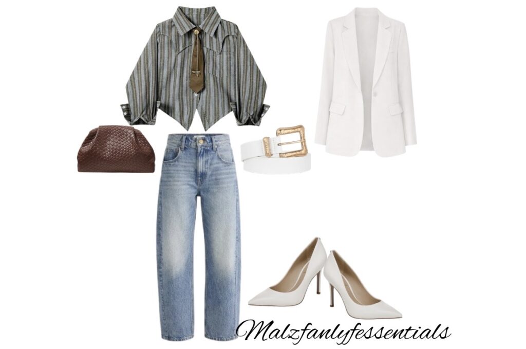 Where classic tailoring meets effortless cool. This look pairs relaxed denim with a statement striped blouse and tie detail, layered under a crisp neutral blazer for a refined finish. The structured heels and textured clutch elevate the ensemble, while the soft silhouette keeps it playful and modern. Perfect for stepping from meetings to dinner—confident, chic, and undeniably put-together.